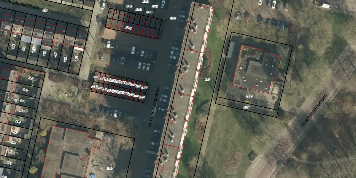 Het perceel waarop Van Goudoeverstraat 97 staat heeft een oppervlakte van 2627 m². Dit is een zeer groot perceel. De perceeloppervlakte wordt geregistreerd door het Kadaster. Gedetailleerde informatie over de maten van dit perceel kunt u vinden in het rapport Kadastrale kaart met maatvoering van Van Goudoeverstraat 97.