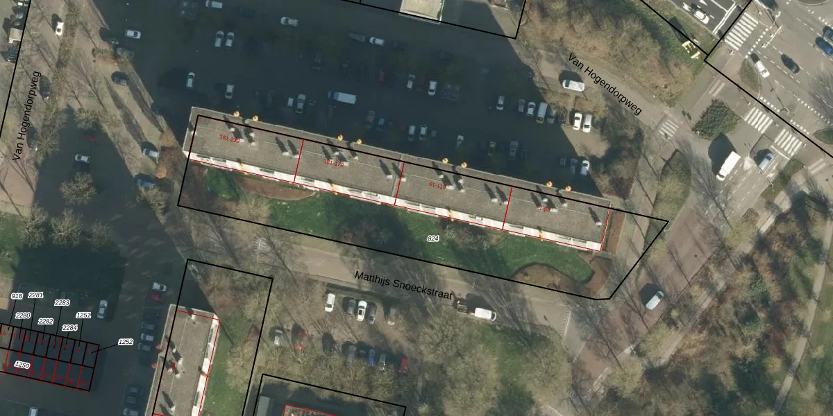 Het perceel waarop Van Hogendorpweg 101 staat heeft een oppervlakte van 2454 m². Dit is een zeer groot perceel. De perceeloppervlakte wordt geregistreerd door het Kadaster. Gedetailleerde informatie over de maten van dit perceel kunt u vinden in het rapport Kadastrale kaart met maatvoering van Van Hogendorpweg 101.