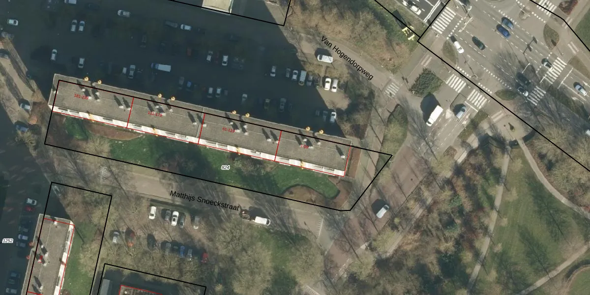Het perceel waarop Van Hogendorpweg 15 staat heeft een oppervlakte van 2454 m². Dit is een zeer groot perceel. De perceeloppervlakte wordt geregistreerd door het Kadaster. Gedetailleerde informatie over de maten van dit perceel kunt u vinden in het rapport Kadastrale kaart met maatvoering van Van Hogendorpweg 15.