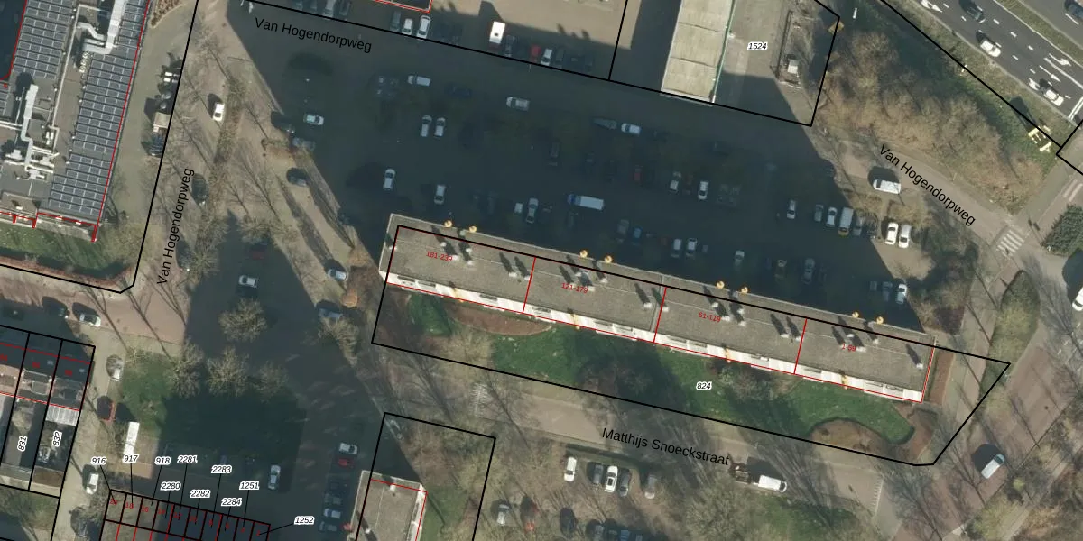 Het perceel waarop Van Hogendorpweg 169 staat heeft een oppervlakte van 2454 m². Dit is een zeer groot perceel. De perceeloppervlakte wordt geregistreerd door het Kadaster. Gedetailleerde informatie over de maten van dit perceel kunt u vinden in het rapport Kadastrale kaart met maatvoering van Van Hogendorpweg 169.