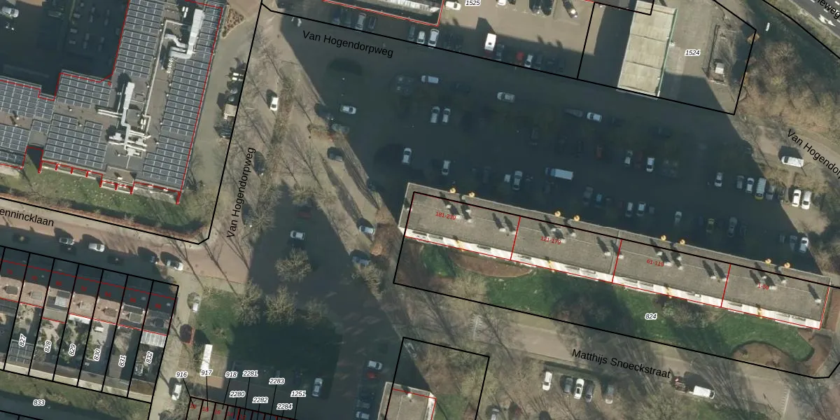 Het perceel waarop Van Hogendorpweg 203 staat heeft een oppervlakte van 2454 m². Dit is een zeer groot perceel. De perceeloppervlakte wordt geregistreerd door het Kadaster. Gedetailleerde informatie over de maten van dit perceel kunt u vinden in het rapport Kadastrale kaart met maatvoering van Van Hogendorpweg 203.