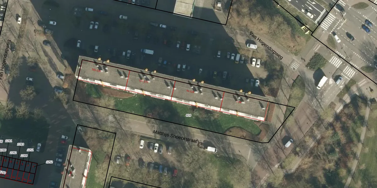 Het perceel waarop Van Hogendorpweg 65 staat heeft een oppervlakte van 2454 m². Dit is een zeer groot perceel. De perceeloppervlakte wordt geregistreerd door het Kadaster. Gedetailleerde informatie over de maten van dit perceel kunt u vinden in het rapport Kadastrale kaart met maatvoering van Van Hogendorpweg 65.