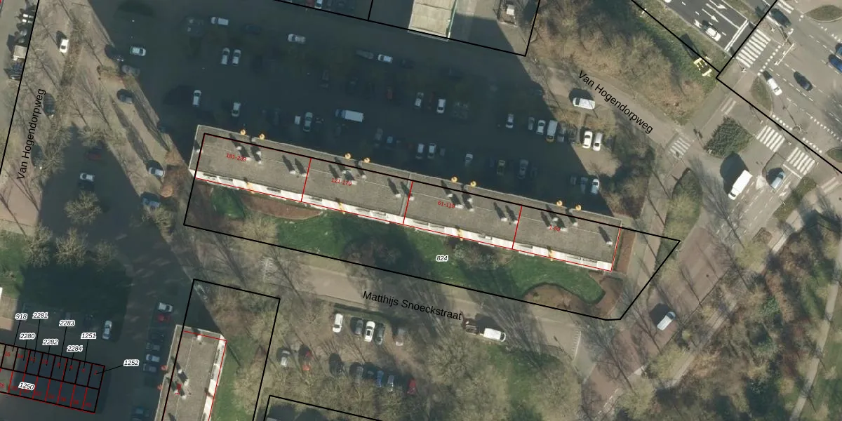 Het perceel waarop Van Hogendorpweg 83 staat heeft een oppervlakte van 2454 m². Dit is een zeer groot perceel. De perceeloppervlakte wordt geregistreerd door het Kadaster. Gedetailleerde informatie over de maten van dit perceel kunt u vinden in het rapport Kadastrale kaart met maatvoering van Van Hogendorpweg 83.