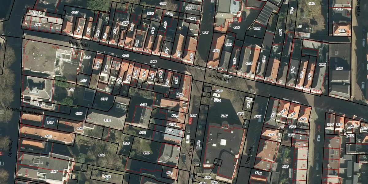 Het perceel waarop Vismarkt 20 staat heeft een oppervlakte van 117 m². Dit is een middelgroot perceel. De perceeloppervlakte wordt geregistreerd door het Kadaster. Gedetailleerde informatie over de maten van dit perceel kunt u vinden in het rapport Kadastrale kaart met maatvoering van Vismarkt 20.