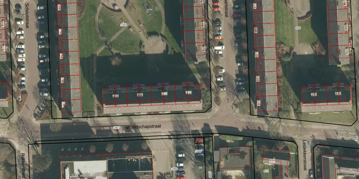 Het perceel waarop Vroedschapstraat 20-b staat heeft een oppervlakte van 9090 m². Dit is een zeer groot perceel. De perceeloppervlakte wordt geregistreerd door het Kadaster. Gedetailleerde informatie over de maten van dit perceel kunt u vinden in het rapport Kadastrale kaart met maatvoering van Vroedschapstraat 20-b.