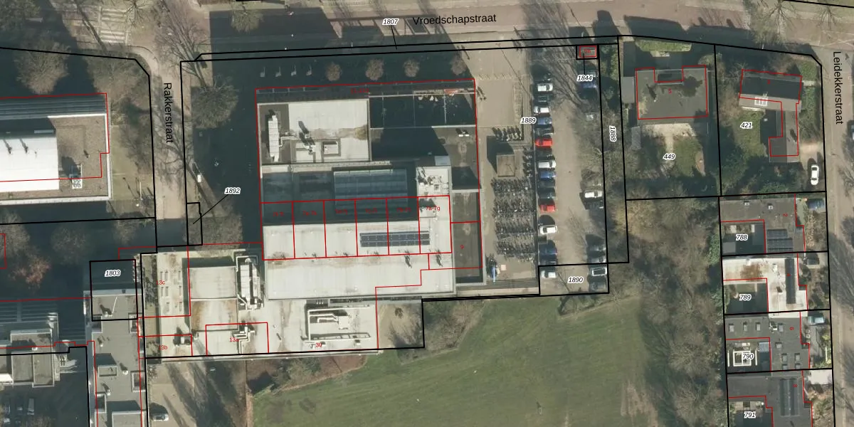 Het perceel waarop Vroedschapstraat 7-a staat heeft een oppervlakte van 6419 m². Dit is een zeer groot perceel. De perceeloppervlakte wordt geregistreerd door het Kadaster. Gedetailleerde informatie over de maten van dit perceel kunt u vinden in het rapport Kadastrale kaart met maatvoering van Vroedschapstraat 7-a.