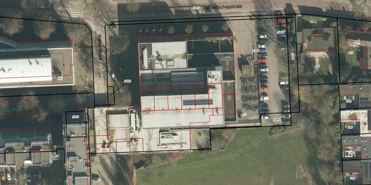 Het perceel waarop Vroedschapstraat 7-c staat heeft een oppervlakte van 6419 m². Dit is een zeer groot perceel. De perceeloppervlakte wordt geregistreerd door het Kadaster. Gedetailleerde informatie over de maten van dit perceel kunt u vinden in het rapport Kadastrale kaart met maatvoering van Vroedschapstraat 7-c.