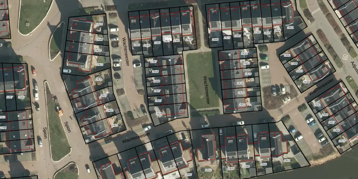 Wachtmeester 5 is gelegen op kadastraal perceel GRC00P2447. Deze kadastrale aanduiding is uniek en wordt gebruikt door het Kadaster om eigendomsrechten en andere zakelijke rechten vast te leggen. Het perceel maakt onderdeel uit van de kadastrale gemeente Gorinchem.