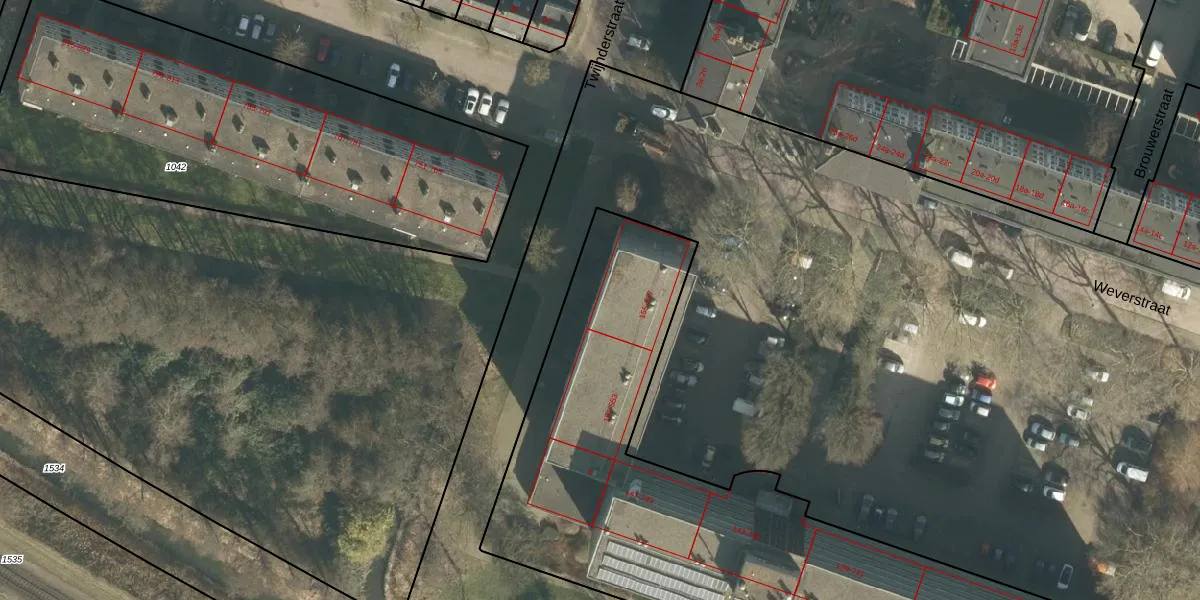Het perceel waarop Weverstraat 555 staat heeft een oppervlakte van 3172 m². Dit is een zeer groot perceel. De perceeloppervlakte wordt geregistreerd door het Kadaster. Gedetailleerde informatie over de maten van dit perceel kunt u vinden in het rapport Kadastrale kaart met maatvoering van Weverstraat 555.