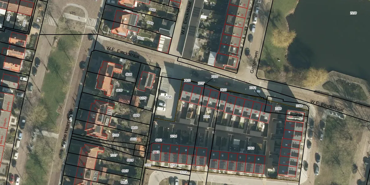 Het perceel waarop W.F. Emckstraat 1-k staat heeft een oppervlakte van 895 m². Dit is een groot perceel. De perceeloppervlakte wordt geregistreerd door het Kadaster. Gedetailleerde informatie over de maten van dit perceel kunt u vinden in het rapport Kadastrale kaart met maatvoering van W.F. Emckstraat 1-k.