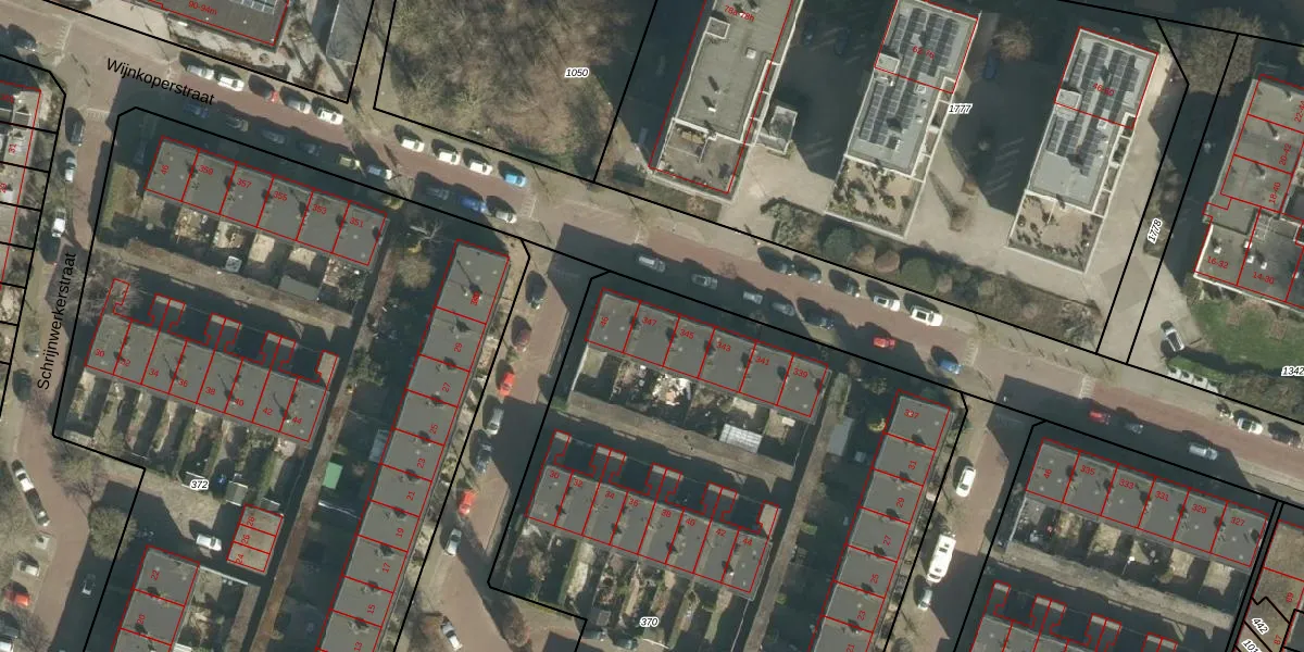 Het perceel waarop Wijnkoperstraat 347 staat heeft een oppervlakte van 7116 m². Dit is een zeer groot perceel. De perceeloppervlakte wordt geregistreerd door het Kadaster. Gedetailleerde informatie over de maten van dit perceel kunt u vinden in het rapport Kadastrale kaart met maatvoering van Wijnkoperstraat 347.