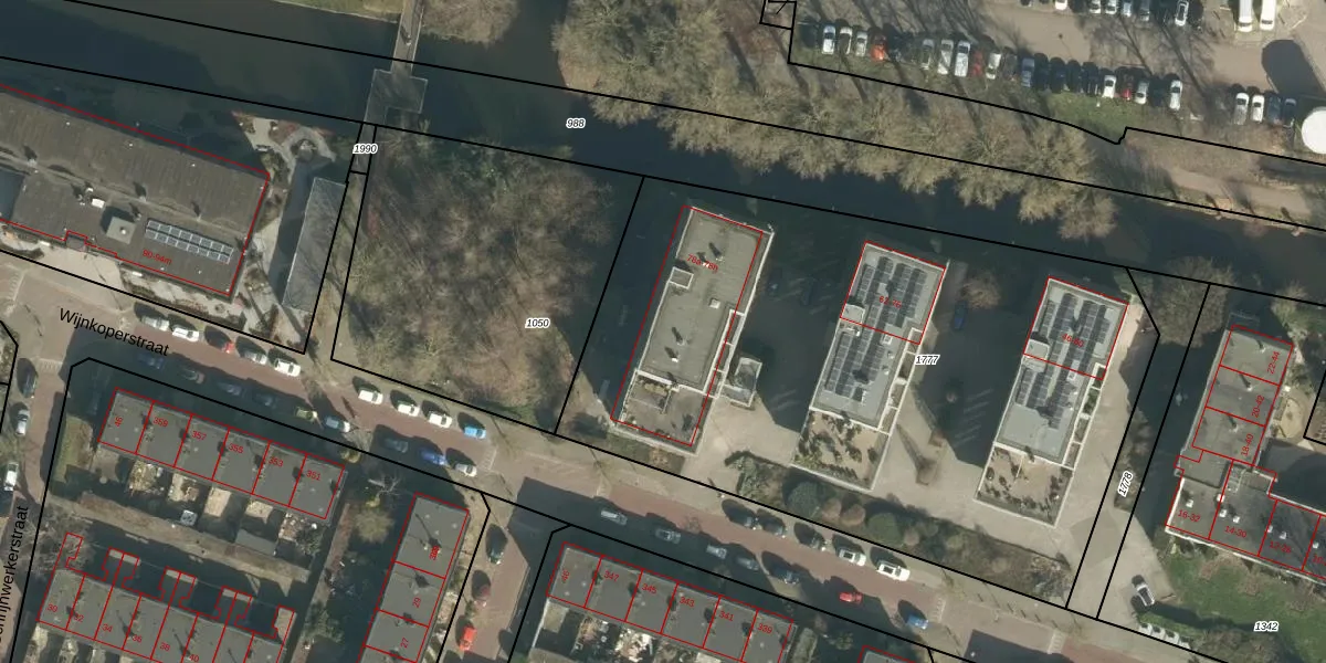 Het perceel waarop Wijnkoperstraat 78-e staat heeft een oppervlakte van 3737 m². Dit is een zeer groot perceel. De perceeloppervlakte wordt geregistreerd door het Kadaster. Gedetailleerde informatie over de maten van dit perceel kunt u vinden in het rapport Kadastrale kaart met maatvoering van Wijnkoperstraat 78-e.