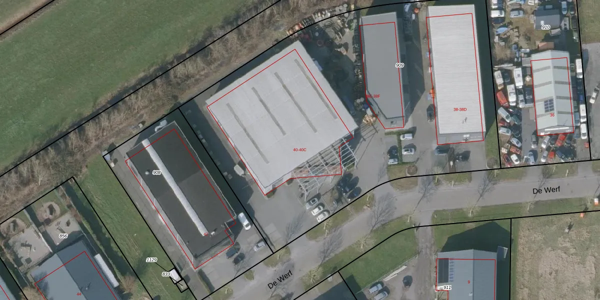 Het perceel waarop De Werf 40 staat heeft een oppervlakte van 5639 m². Dit is een zeer groot perceel. De perceeloppervlakte wordt geregistreerd door het Kadaster. Gedetailleerde informatie over de maten van dit perceel kunt u vinden in het rapport Kadastrale kaart met maatvoering van De Werf 40.