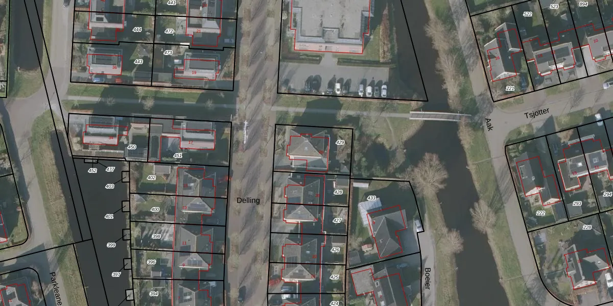 Het perceel waarop Delling 28 staat heeft een oppervlakte van 385 m². Dit is een groot perceel. De perceeloppervlakte wordt geregistreerd door het Kadaster. Gedetailleerde informatie over de maten van dit perceel kunt u vinden in het rapport Kadastrale kaart met maatvoering van Delling 28.