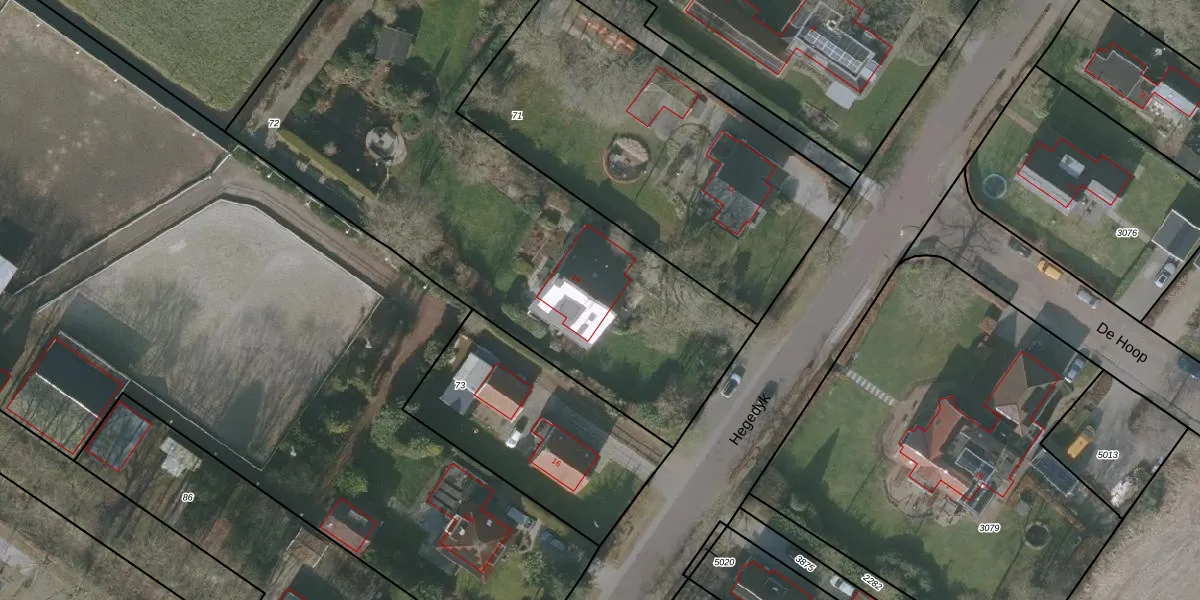 Het perceel waarop Hegedyk 14 staat heeft een oppervlakte van 3417 m². Dit is een zeer groot perceel. De perceeloppervlakte wordt geregistreerd door het Kadaster. Gedetailleerde informatie over de maten van dit perceel kunt u vinden in het rapport Kadastrale kaart met maatvoering van Hegedyk 14.