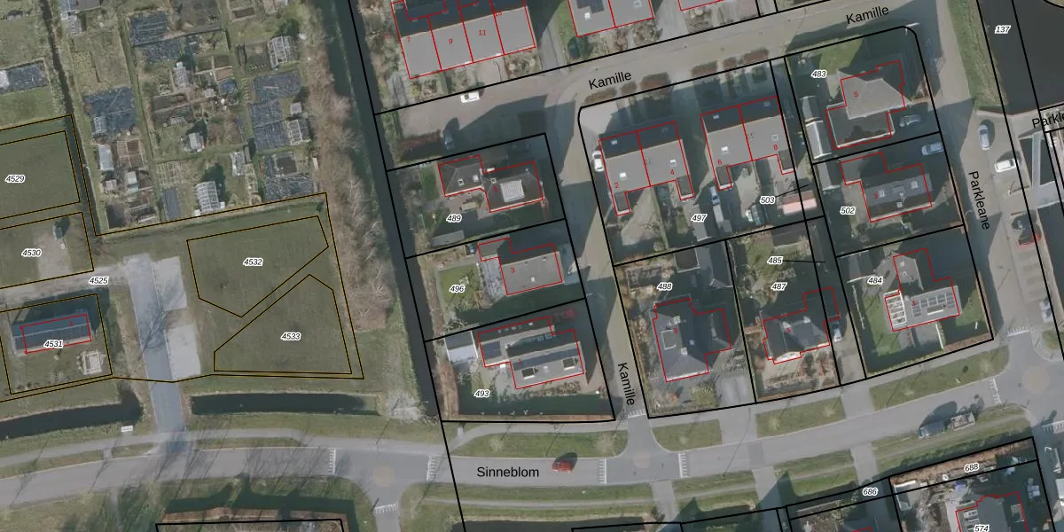 Het perceel waarop Kamille 3 staat heeft een oppervlakte van 494 m². Dit is een groot perceel. De perceeloppervlakte wordt geregistreerd door het Kadaster. Gedetailleerde informatie over de maten van dit perceel kunt u vinden in het rapport Kadastrale kaart met maatvoering van Kamille 3.