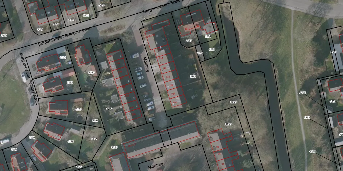 Mouterij 108 is gelegen op kadastraal perceel GRD00B3188. Deze kadastrale aanduiding is uniek en wordt gebruikt door het Kadaster om eigendomsrechten en andere zakelijke rechten vast te leggen. Het perceel maakt onderdeel uit van de kadastrale gemeente Gorredijk.