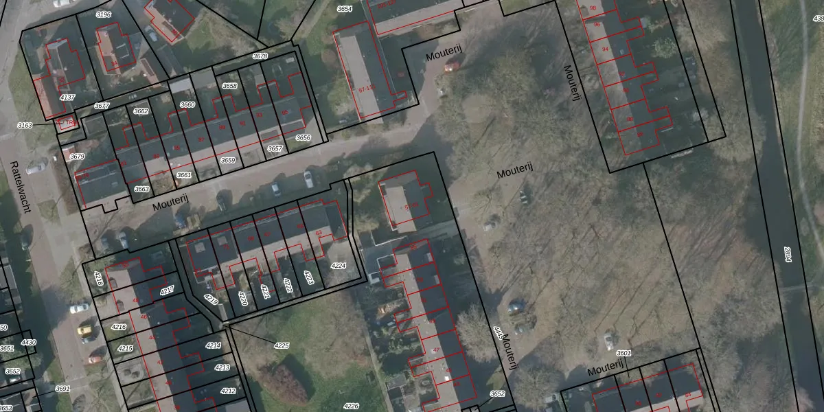 Het perceel waarop Mouterij 57 staat heeft een oppervlakte van 3610 m². Dit is een zeer groot perceel. De perceeloppervlakte wordt geregistreerd door het Kadaster. Gedetailleerde informatie over de maten van dit perceel kunt u vinden in het rapport Kadastrale kaart met maatvoering van Mouterij 57.