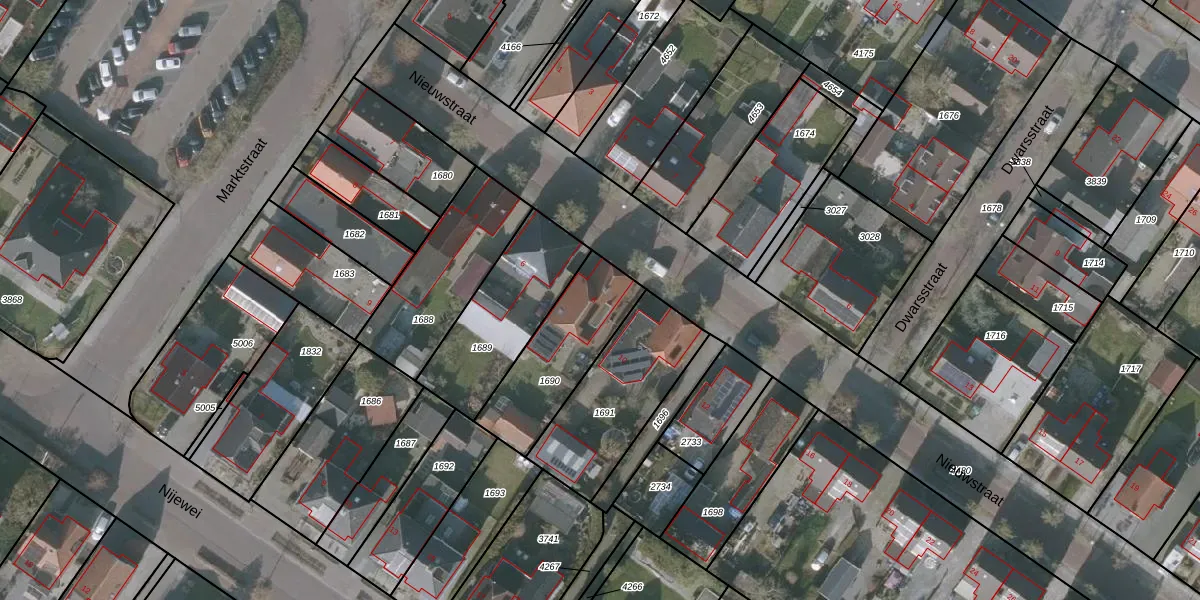 Het perceel waarop Nieuwstraat 8 staat heeft een oppervlakte van 381 m². Dit is een groot perceel. De perceeloppervlakte wordt geregistreerd door het Kadaster. Gedetailleerde informatie over de maten van dit perceel kunt u vinden in het rapport Kadastrale kaart met maatvoering van Nieuwstraat 8.
