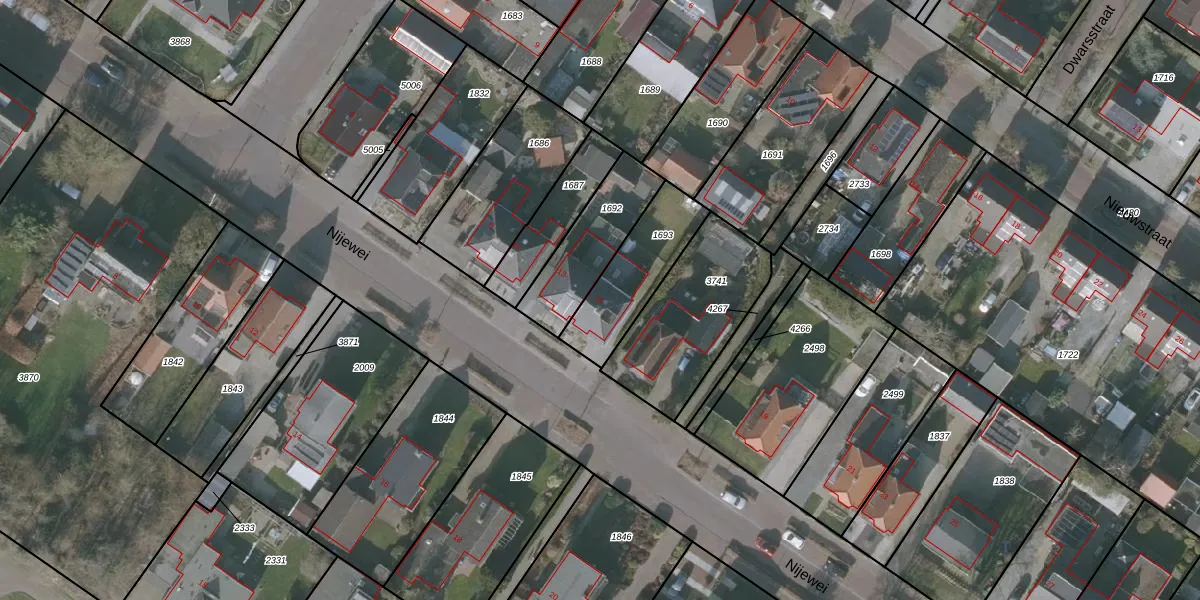 Het perceel waarop Nijewei 15 staat heeft een oppervlakte van 285 m². Dit is een middelgroot perceel. De perceeloppervlakte wordt geregistreerd door het Kadaster. Gedetailleerde informatie over de maten van dit perceel kunt u vinden in het rapport Kadastrale kaart met maatvoering van Nijewei 15.