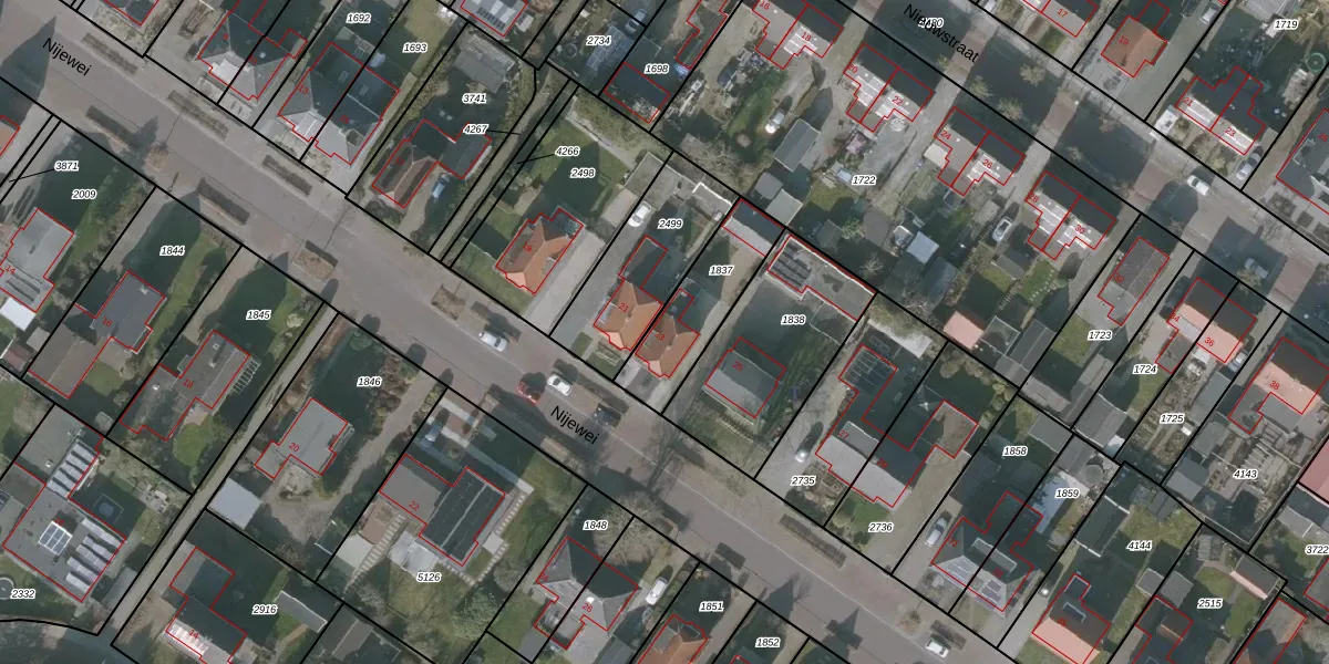Het perceel waarop Nijewei 23 staat heeft een oppervlakte van 301 m². Dit is een groot perceel. De perceeloppervlakte wordt geregistreerd door het Kadaster. Gedetailleerde informatie over de maten van dit perceel kunt u vinden in het rapport Kadastrale kaart met maatvoering van Nijewei 23.