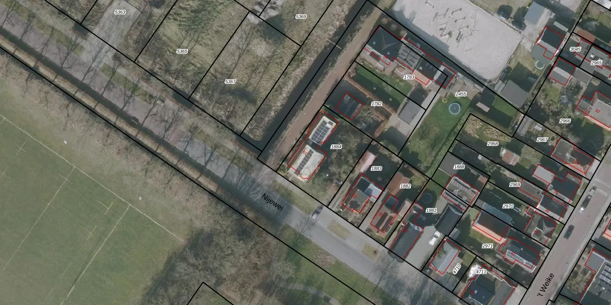 Het perceel waarop Nijewei 61 staat heeft een oppervlakte van 540 m². Dit is een groot perceel. De perceeloppervlakte wordt geregistreerd door het Kadaster. Gedetailleerde informatie over de maten van dit perceel kunt u vinden in het rapport Kadastrale kaart met maatvoering van Nijewei 61.
