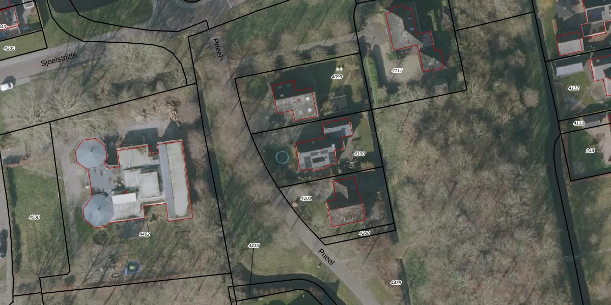 Prieel 5 is gelegen op kadastraal perceel GRD00B4100. Deze kadastrale aanduiding is uniek en wordt gebruikt door het Kadaster om eigendomsrechten en andere zakelijke rechten vast te leggen. Het perceel maakt onderdeel uit van de kadastrale gemeente Gorredijk.