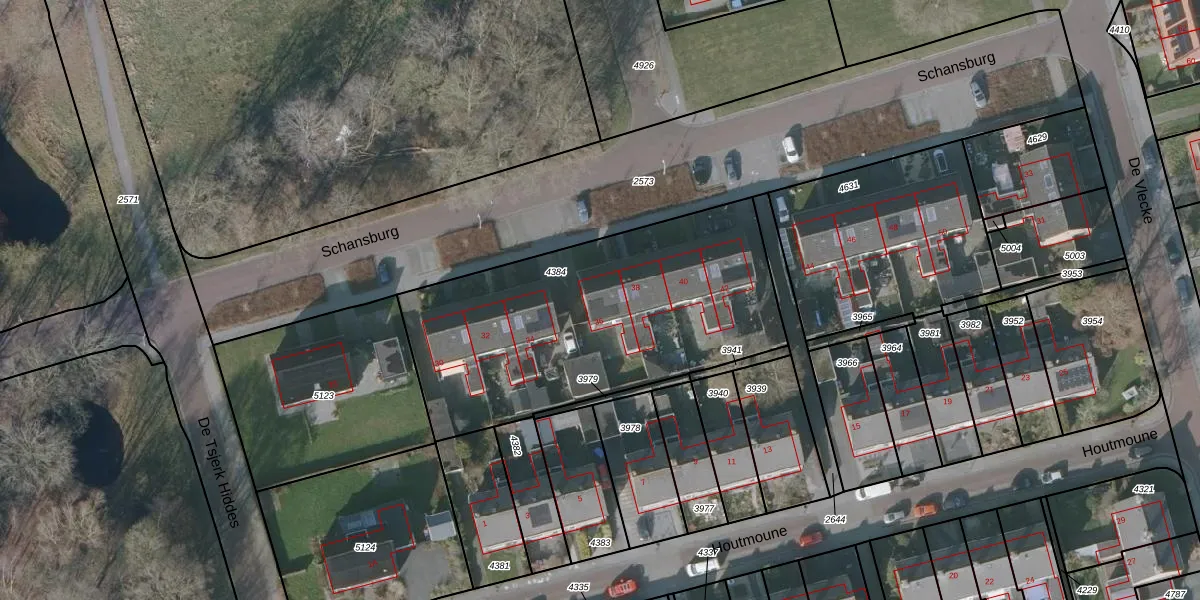 Het perceel waarop Schansburg 36 staat heeft een oppervlakte van 1557 m². Dit is een zeer groot perceel. De perceeloppervlakte wordt geregistreerd door het Kadaster. Gedetailleerde informatie over de maten van dit perceel kunt u vinden in het rapport Kadastrale kaart met maatvoering van Schansburg 36.