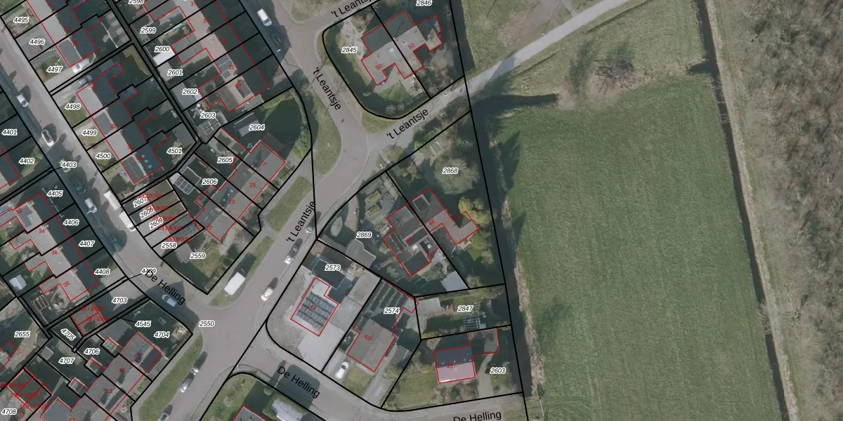 Het perceel waarop 't Leantsje 48 staat heeft een oppervlakte van 585 m². Dit is een groot perceel. De perceeloppervlakte wordt geregistreerd door het Kadaster. Gedetailleerde informatie over de maten van dit perceel kunt u vinden in het rapport Kadastrale kaart met maatvoering van 't Leantsje 48.