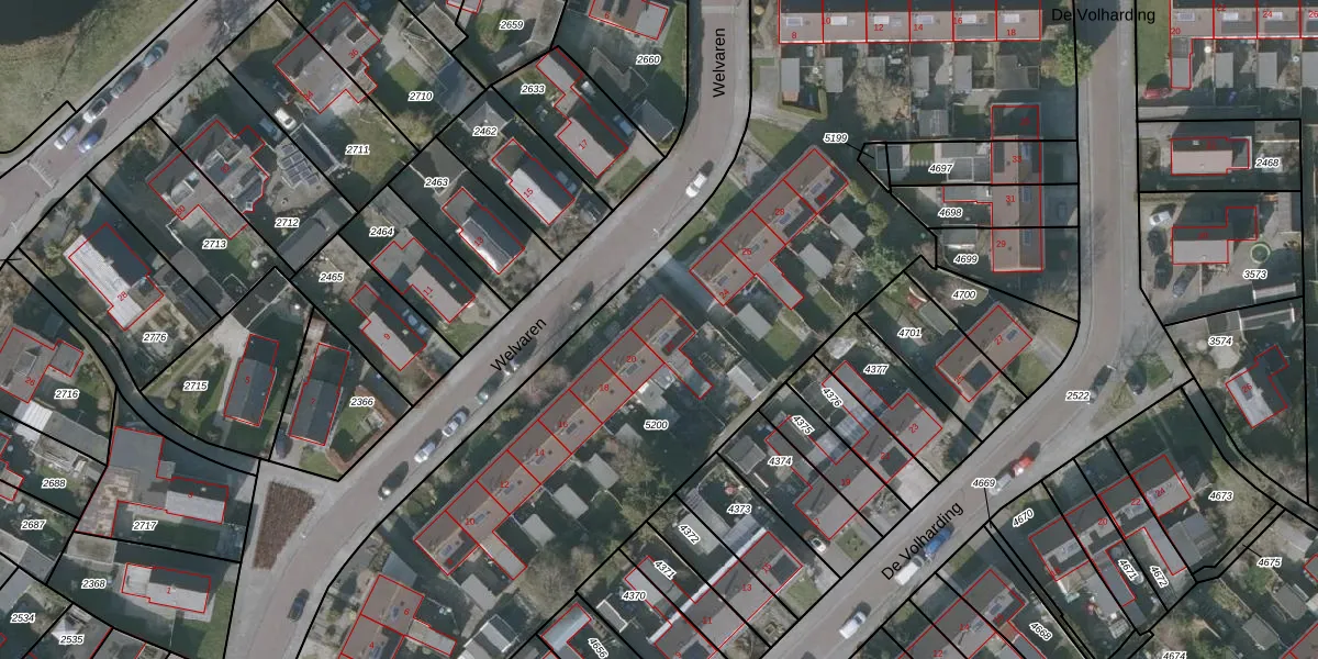 Het perceel waarop Welvaren 22 staat heeft een oppervlakte van 4572 m². Dit is een zeer groot perceel. De perceeloppervlakte wordt geregistreerd door het Kadaster. Gedetailleerde informatie over de maten van dit perceel kunt u vinden in het rapport Kadastrale kaart met maatvoering van Welvaren 22.