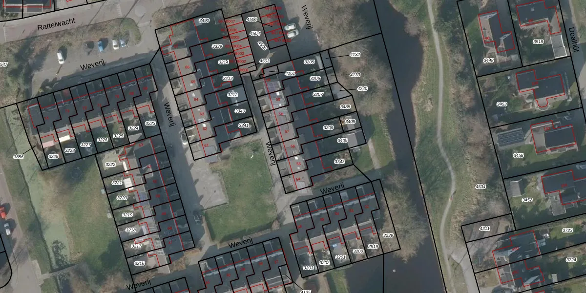 Het perceel waarop Weverij 56 staat heeft een oppervlakte van 143 m². Dit is een middelgroot perceel. De perceeloppervlakte wordt geregistreerd door het Kadaster. Gedetailleerde informatie over de maten van dit perceel kunt u vinden in het rapport Kadastrale kaart met maatvoering van Weverij 56.