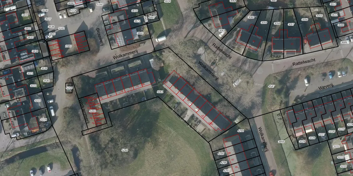 Wolkammerij 65 is gelegen op kadastraal perceel GRD00C5061. Deze kadastrale aanduiding is uniek en wordt gebruikt door het Kadaster om eigendomsrechten en andere zakelijke rechten vast te leggen. Het perceel maakt onderdeel uit van de kadastrale gemeente Gorredijk.