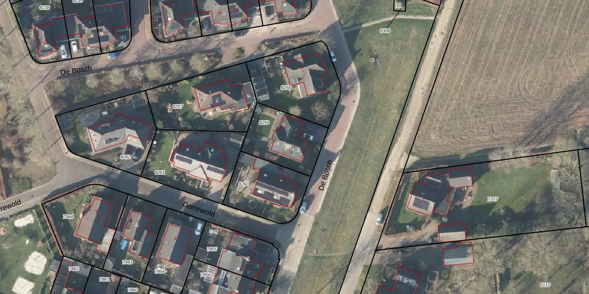 Het perceel waarop De Bosch 3 staat heeft een oppervlakte van 448 m². Dit is een groot perceel. De perceeloppervlakte wordt geregistreerd door het Kadaster. Gedetailleerde informatie over de maten van dit perceel kunt u vinden in het rapport Kadastrale kaart met maatvoering van De Bosch 3.
