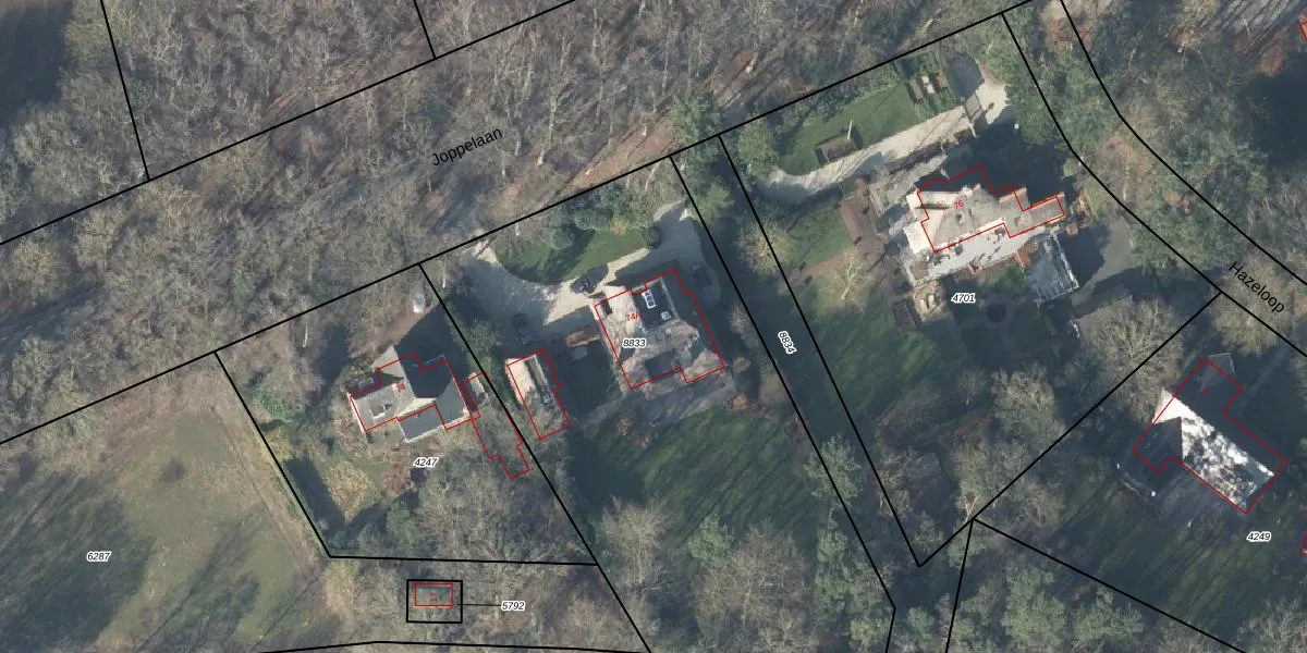 Het perceel waarop Joppelaan 74-a staat heeft een oppervlakte van 3094 m². Dit is een zeer groot perceel. De perceeloppervlakte wordt geregistreerd door het Kadaster. Gedetailleerde informatie over de maten van dit perceel kunt u vinden in het rapport Kadastrale kaart met maatvoering van Joppelaan 74-a.