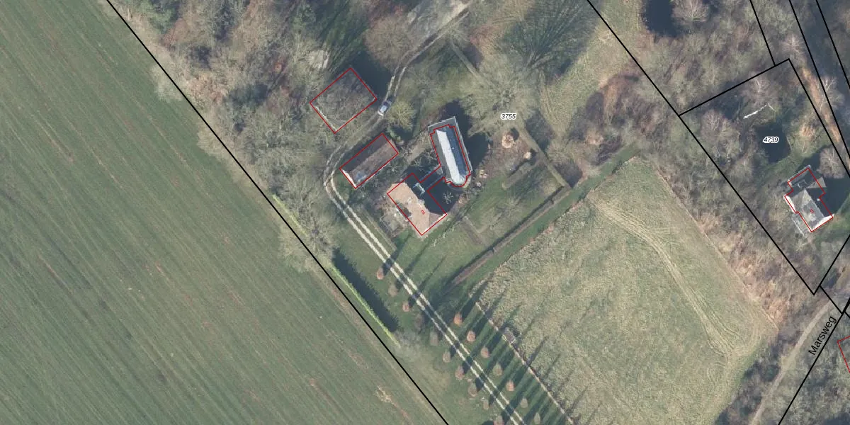 Het perceel waarop Marsweg 3 staat heeft een oppervlakte van 2,2 ha. Dit is een zeer groot perceel. De perceeloppervlakte wordt geregistreerd door het Kadaster. Gedetailleerde informatie over de maten van dit perceel kunt u vinden in het rapport Kadastrale kaart met maatvoering van Marsweg 3.