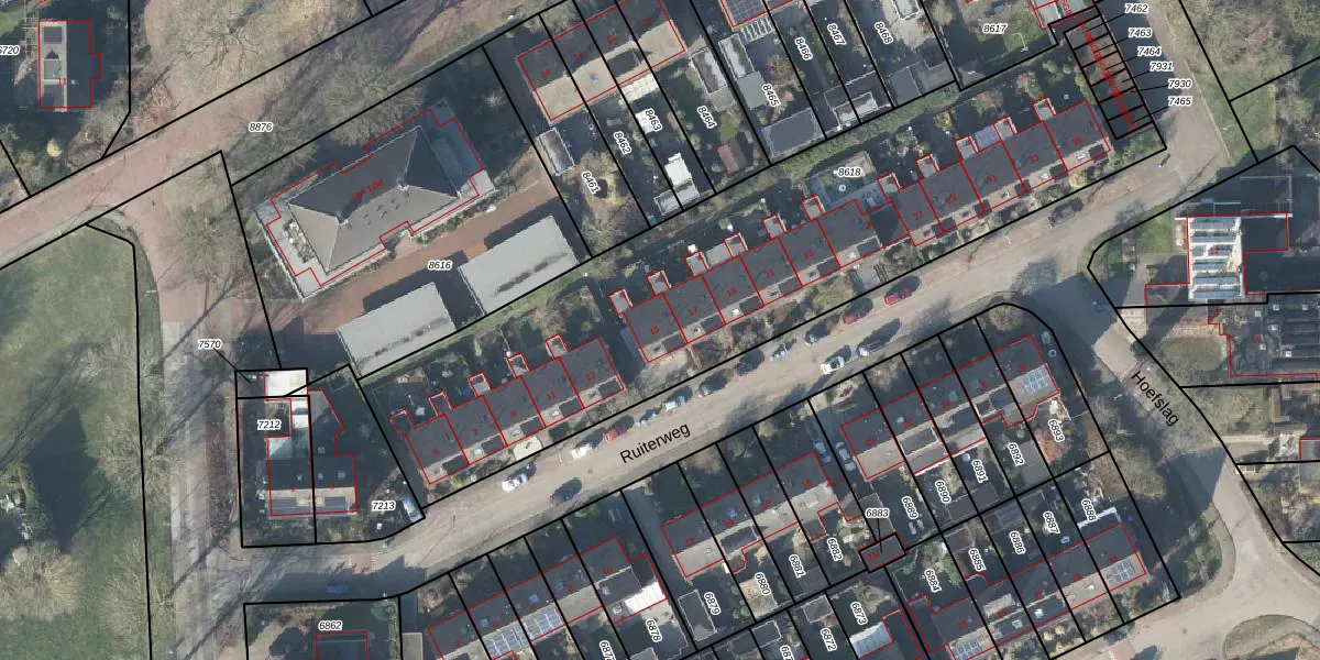 Het perceel waarop Ruiterweg 15 staat heeft een oppervlakte van 2742 m². Dit is een zeer groot perceel. De perceeloppervlakte wordt geregistreerd door het Kadaster. Gedetailleerde informatie over de maten van dit perceel kunt u vinden in het rapport Kadastrale kaart met maatvoering van Ruiterweg 15.