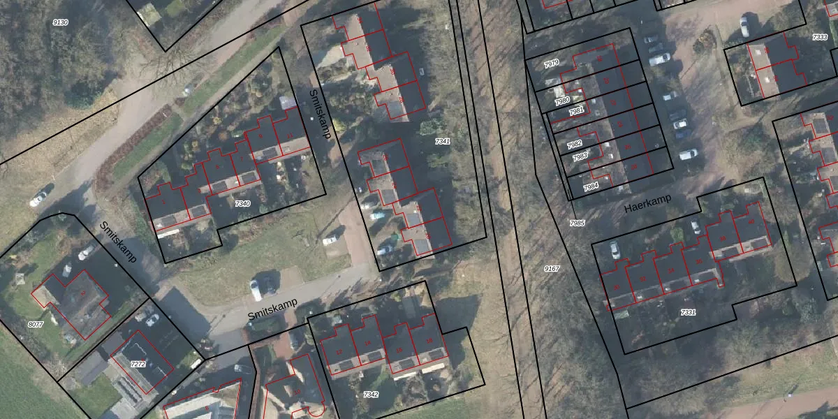 Het perceel waarop Smitskamp 22 staat heeft een oppervlakte van 1954 m². Dit is een zeer groot perceel. De perceeloppervlakte wordt geregistreerd door het Kadaster. Gedetailleerde informatie over de maten van dit perceel kunt u vinden in het rapport Kadastrale kaart met maatvoering van Smitskamp 22.