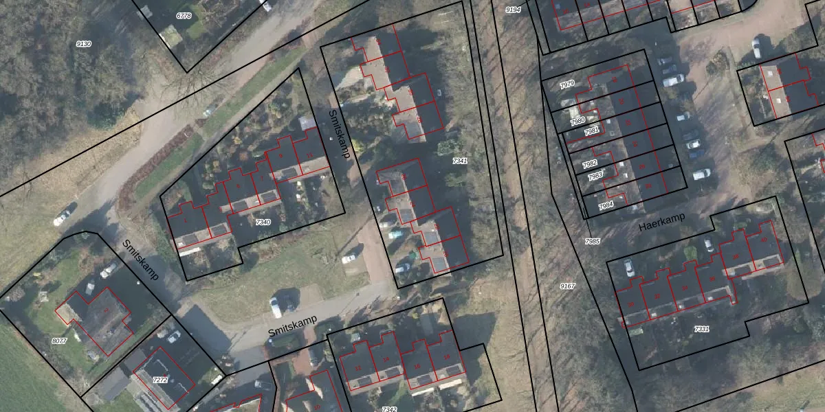 Het perceel waarop Smitskamp 24 staat heeft een oppervlakte van 1954 m². Dit is een zeer groot perceel. De perceeloppervlakte wordt geregistreerd door het Kadaster. Gedetailleerde informatie over de maten van dit perceel kunt u vinden in het rapport Kadastrale kaart met maatvoering van Smitskamp 24.