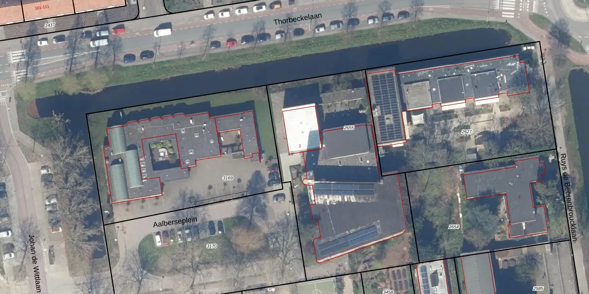Het perceel waarop Aalberseplein 2 staat heeft een oppervlakte van 2454 m². Dit is een zeer groot perceel. De perceeloppervlakte wordt geregistreerd door het Kadaster. Gedetailleerde informatie over de maten van dit perceel kunt u vinden in het rapport Kadastrale kaart met maatvoering van Aalberseplein 2.