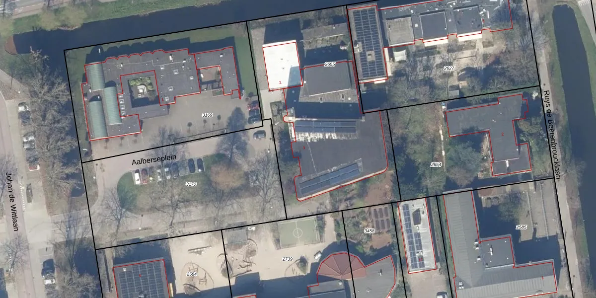 Het perceel waarop Aalberseplein 3 staat heeft een oppervlakte van 2454 m². Dit is een zeer groot perceel. De perceeloppervlakte wordt geregistreerd door het Kadaster. Gedetailleerde informatie over de maten van dit perceel kunt u vinden in het rapport Kadastrale kaart met maatvoering van Aalberseplein 3.