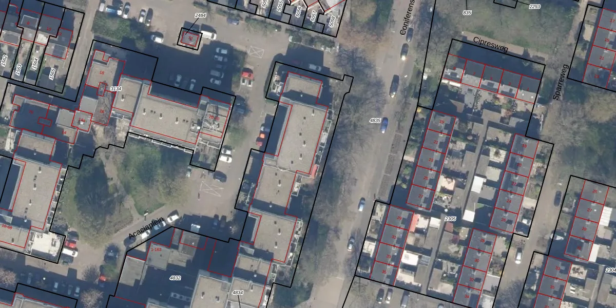 Het perceel waarop Acaciaplein 27 staat heeft een oppervlakte van 4434 m². Dit is een zeer groot perceel. De perceeloppervlakte wordt geregistreerd door het Kadaster. Gedetailleerde informatie over de maten van dit perceel kunt u vinden in het rapport Kadastrale kaart met maatvoering van Acaciaplein 27.