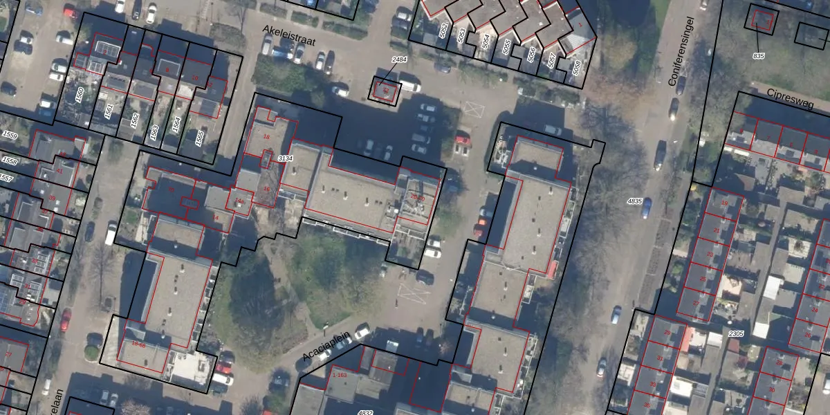 Het perceel waarop Akeleistraat 66 staat heeft een oppervlakte van 2510 m². Dit is een zeer groot perceel. De perceeloppervlakte wordt geregistreerd door het Kadaster. Gedetailleerde informatie over de maten van dit perceel kunt u vinden in het rapport Kadastrale kaart met maatvoering van Akeleistraat 66.