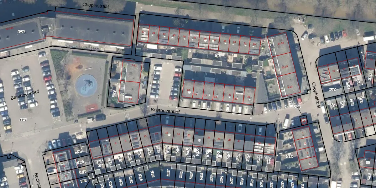 Het perceel waarop Beethovenhof 13 staat heeft een oppervlakte van 3355 m². Dit is een zeer groot perceel. De perceeloppervlakte wordt geregistreerd door het Kadaster. Gedetailleerde informatie over de maten van dit perceel kunt u vinden in het rapport Kadastrale kaart met maatvoering van Beethovenhof 13.