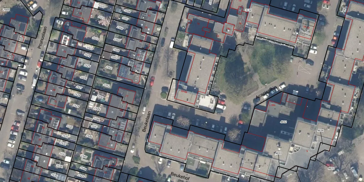 Het perceel waarop Beukelaan 20 staat heeft een oppervlakte van 2510 m². Dit is een zeer groot perceel. De perceeloppervlakte wordt geregistreerd door het Kadaster. Gedetailleerde informatie over de maten van dit perceel kunt u vinden in het rapport Kadastrale kaart met maatvoering van Beukelaan 20.