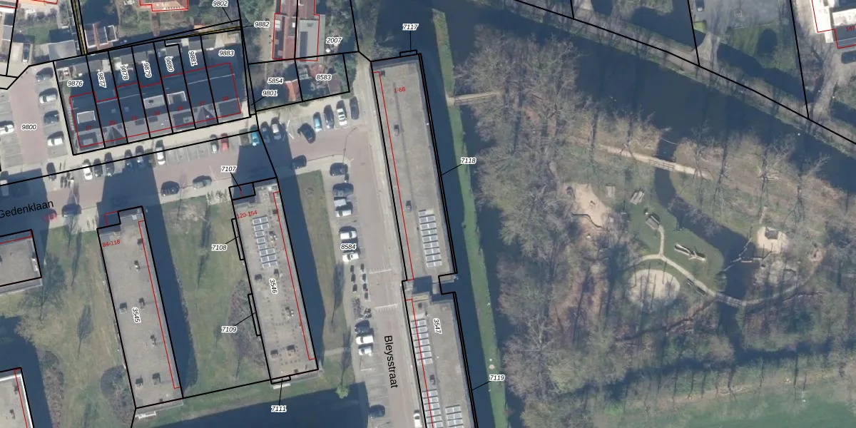 Het perceel waarop Bleysstraat 21 staat heeft een oppervlakte van 1217 m². Dit is een zeer groot perceel. De perceeloppervlakte wordt geregistreerd door het Kadaster. Gedetailleerde informatie over de maten van dit perceel kunt u vinden in het rapport Kadastrale kaart met maatvoering van Bleysstraat 21.