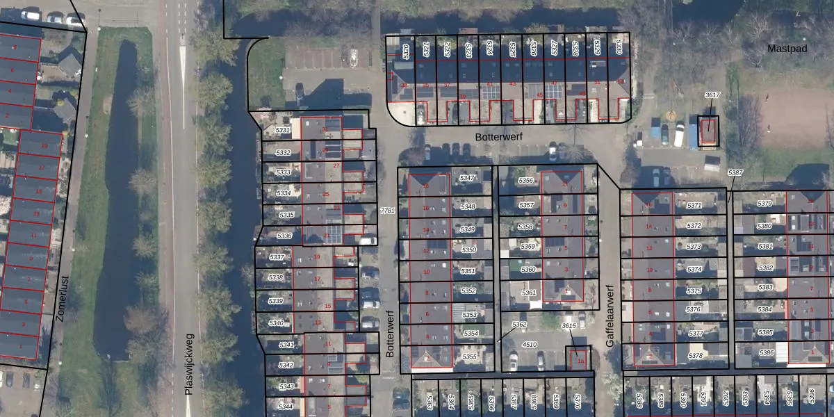 Botterwerf 16 is gelegen op kadastraal perceel GDA01M5348. Deze kadastrale aanduiding is uniek en wordt gebruikt door het Kadaster om eigendomsrechten en andere zakelijke rechten vast te leggen. Het perceel maakt onderdeel uit van de kadastrale gemeente Gouda.