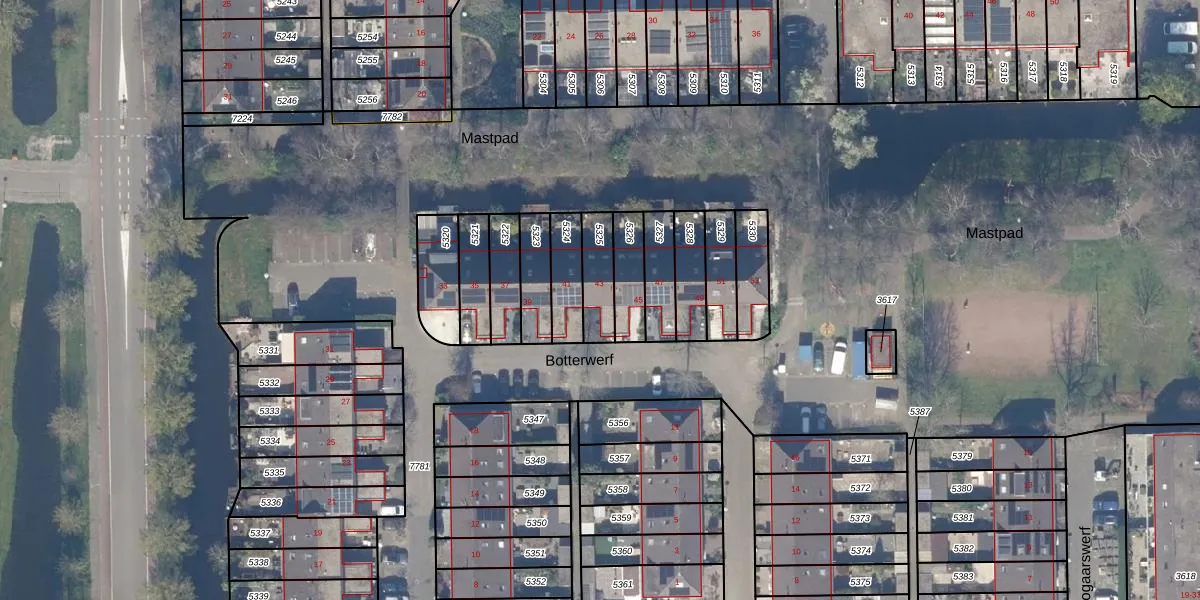 Botterwerf 43 is gelegen op kadastraal perceel GDA01M5325. Deze kadastrale aanduiding is uniek en wordt gebruikt door het Kadaster om eigendomsrechten en andere zakelijke rechten vast te leggen. Het perceel maakt onderdeel uit van de kadastrale gemeente Gouda.