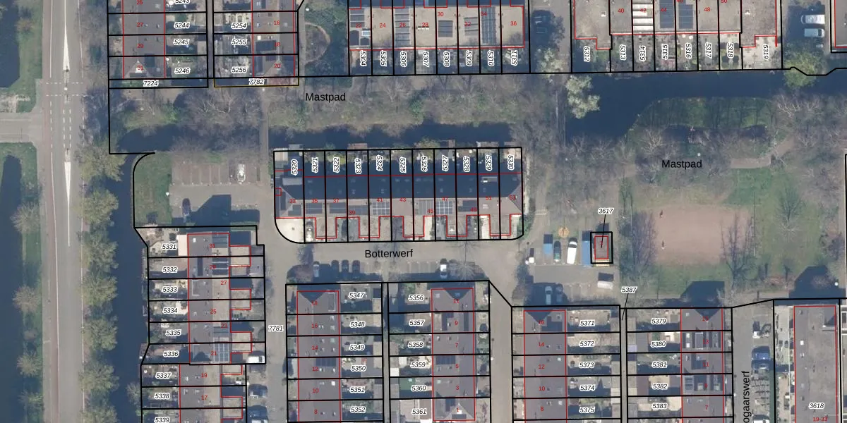 Botterwerf 45 is gelegen op kadastraal perceel GDA01M5326. Deze kadastrale aanduiding is uniek en wordt gebruikt door het Kadaster om eigendomsrechten en andere zakelijke rechten vast te leggen. Het perceel maakt onderdeel uit van de kadastrale gemeente Gouda.