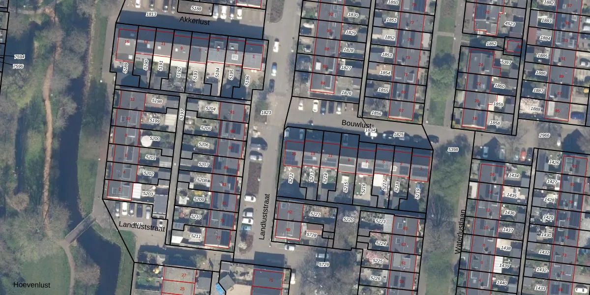 Het perceel waarop Bouwlust 15 staat heeft een oppervlakte van 185 m². Dit is een middelgroot perceel. De perceeloppervlakte wordt geregistreerd door het Kadaster. Gedetailleerde informatie over de maten van dit perceel kunt u vinden in het rapport Kadastrale kaart met maatvoering van Bouwlust 15.
