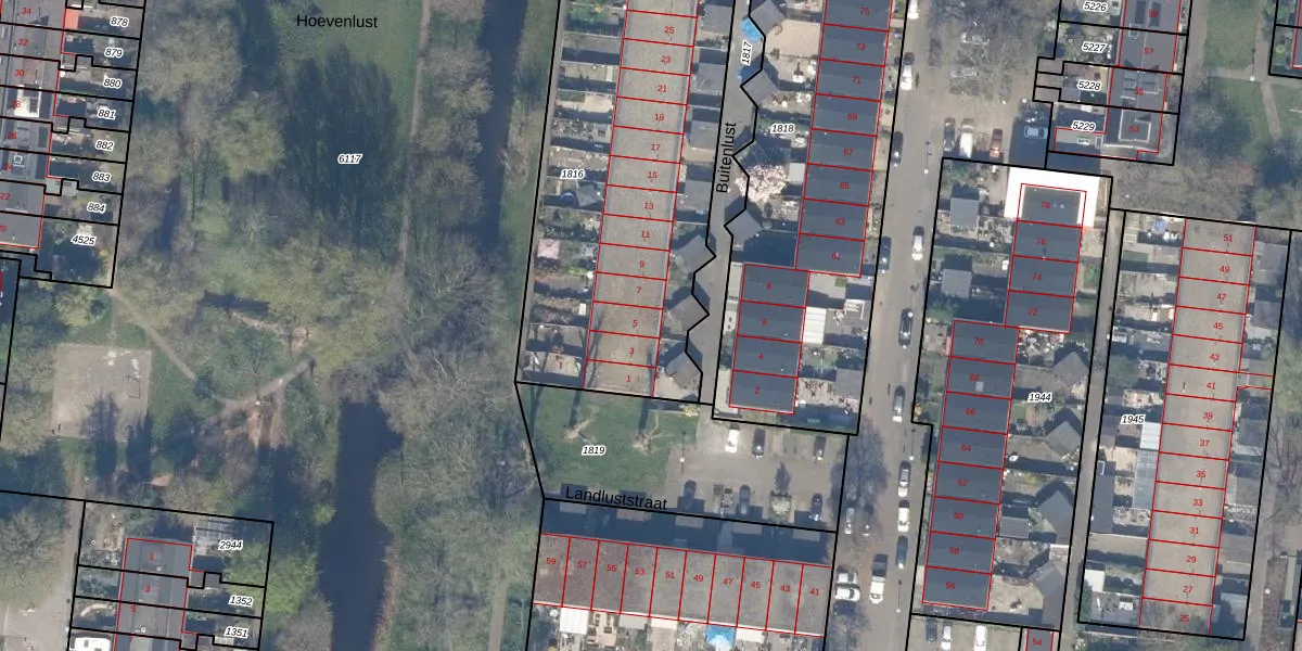 Buitenlust 5 is gelegen op kadastraal perceel GDA01M1816. Deze kadastrale aanduiding is uniek en wordt gebruikt door het Kadaster om eigendomsrechten en andere zakelijke rechten vast te leggen. Het perceel maakt onderdeel uit van de kadastrale gemeente Gouda.